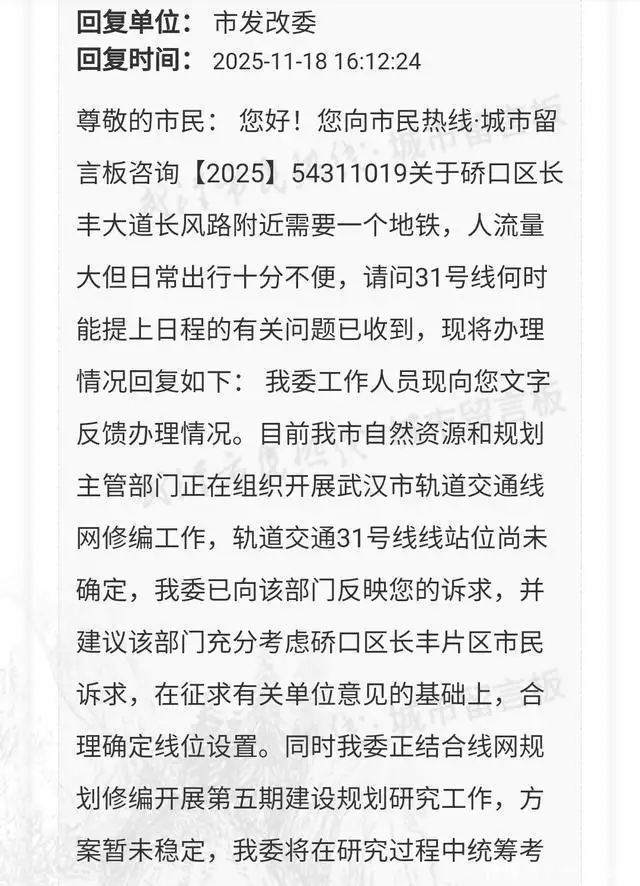 对此,武汉市发改委进行了回复,目前我市自然资源和规划主管部门正在组织开展武汉市轨道交通线网修编工作,轨道交通31号线线站位尚未确定,我委已向该部门反映您的诉求,并建议该部门充分考虑硚口区长丰片区市民诉求,在征求有关单位意见的基础上,合理确定线位设置。同时我委正结合线网规划修编开展第五期建设规划研究工作,方案暂未稳定,我委将在研究过程中统筹考虑相关线路。